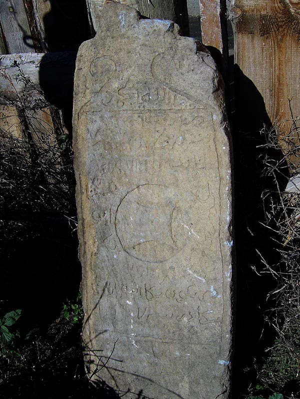 Taşnı üsünde Arap tilde emda Arap harifle bla cazılgan Karaçay-Malkar tilde cazuvla bardıla. Taşnı betinde, örge canında Arap tilde; “Allah, Muhammad, dagıda tört ullu halifni atları: Abubekir, Umar, Osman, Aliy” deb cazılgandı. Taşnı enişge canında Arap harifle bla Karaçay-Malkar tilde “Bügün Manga, Tambla Sanga” deb cazılgandı.