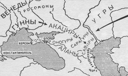 M. İ. Artamonov, Kafkasya’nın V. yüzyıldaki etnik haritasını şöyle çizmektedir; Dağıstan’ın kuzeyinden Kuma Irmağı ve onun kollarının çevrelediği yerlerde Sabirler [s. 14 ] ile onların biraz yukarısında Şaragurlar yaşamaktadır. Onların kuzeyinde ve batısında yani bugünkü Adige Ö. C. ve Krasnodar ile Stavrapol çevresinden Azak Denizi ' 'ne kadar olan yerlerde Onogurlar yaşamaktadır. Azak Denizi ' 'nin kuzey kıyılarından doğu ve güneye doğru Şaragurlara kadar olan yerlerde Akatsirler (Akaçir) yaşmaktadır. Bugünkü Karaçay-Çerkes Ö. C. ile Kabardey-Balkar Ö. C. ve Digorya (Kuzey Osetya) bölgelerinin tamamında da Alanlar yaşamaktadır (Artamonov 62: 71).